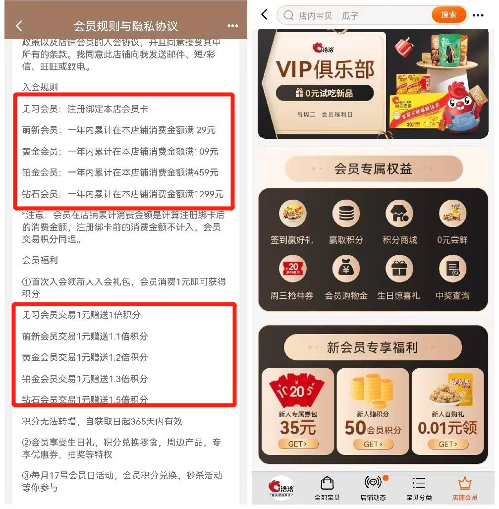 洽洽電商平臺的會員體系也很完善,主要以成長會員+積分體系為主。下面以天貓平臺的會員體系為例。