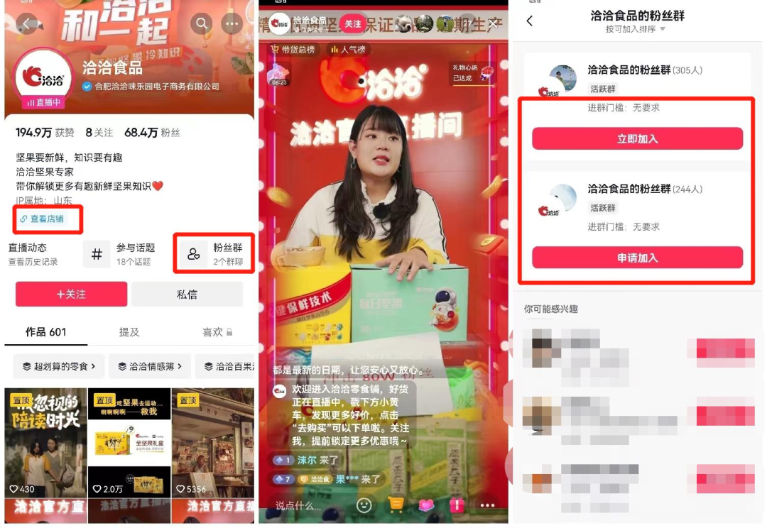 賬號首頁設(shè)置明顯的店鋪和社群入口,用戶點(diǎn)擊即可進(jìn)入店鋪選購商品或加入社群。