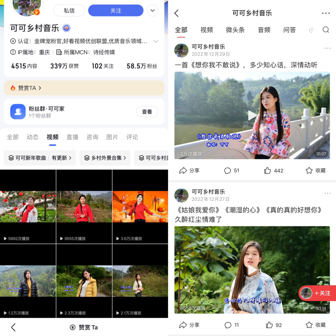 這個(gè)賬號(hào)是分享音樂的賬號(hào),但又不是熱門音樂,而是那種農(nóng)村或者四五線很土的土味音樂。