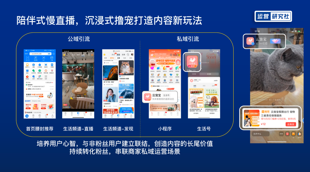 普通用戶(hù)對(duì)于萌寵有天然的喜愛(ài),所以云寵寶在私域內(nèi)容上也頗為用心,不斷在生活號(hào)嘗試制作一些寵物相關(guān)內(nèi)容,包括分享養(yǎng)寵知識(shí)、養(yǎng)寵話(huà)題交流。金秋消費(fèi)節(jié)期間,云寵寶嘗試了陪伴式慢直播,比如“貓咖慢直播”(在貓咖店進(jìn)行在線(xiàn)云擼貓直播),幾乎沒(méi)有投入人力、精力的情況下,收獲數(shù)萬(wàn)場(chǎng)觀和一定的自然轉(zhuǎn)化。