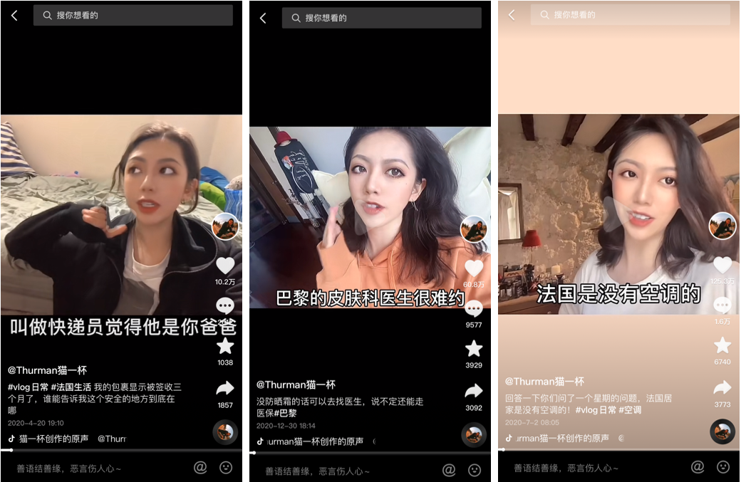 貓一杯曾經(jīng)在法國留學(xué)時(shí)讀服裝設(shè)計(jì)相關(guān)專業(yè)。她最早期在抖音更新的視頻中,就以“單人面對鏡頭口述”的形式跟大家嘮嗑在法國讀書生活時(shí)遇到的趣事,比如“巴黎快遞員有多拽”、“在法國沒有空調(diào)夏天有多熱”、“在巴黎看個(gè)皮膚科有多難”。之后貓一杯養(yǎng)的寵物小豚鼠也成為她的視頻素材;等到 2020 年 10 月,貓一杯回國回到家鄉(xiāng)廣東后,便開始更多地分享自己家人的故事,比如“當(dāng)爸媽開始迷戀上用網(wǎng)絡(luò)熱詞”、“奶奶去巴黎旅游”。當(dāng)然,貓一杯的選題并不局限于這些。似乎生活中任何一件小事都可以成為她的素材,從“吐槽廣東蟑螂”、“吐槽廣東降溫”到“回憶學(xué)生時(shí)代的班主任”,貓一杯都可以把他們編成段子。而之所以說“分享生活趣事”是條討巧的賽道,有三點(diǎn)原因:第一,每個(gè)人的生活體驗(yàn)都具有獨(dú)一無二性。貓一杯的內(nèi)容和自身所處環(huán)境緊密切合,因此不容易被替代。換句話說,很難在全網(wǎng)找出另一個(gè)和貓一杯內(nèi)容相似的創(chuàng)作者。第二,“搞笑生活”賽道不管是放在抖音、小紅書、B站都很適用,能對上各平臺用戶的“胃口”。畢竟刷刷段子是當(dāng)代大多數(shù)人的快樂源泉。據(jù)今年 8 月抖音創(chuàng)作者大會公布的數(shù)據(jù),抖音日均播放量超 1 億的內(nèi)容中,生活記錄類占比達(dá) 21%;