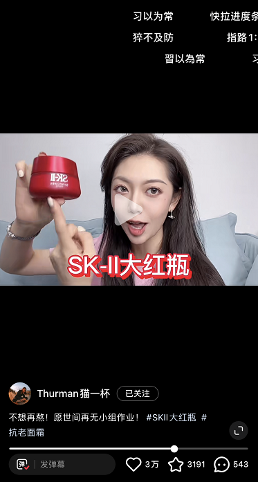 第三,更重要的是,“搞笑生活”內(nèi)容非常適合植入廣告,也很受廣告主青睞。試想,一個(gè)人的生活中會接觸到各種產(chǎn)品,那么在分享生活時(shí)安利好物,看上去也顯得不突兀。像貓一杯在嘮嗑時(shí),就能自然地 cue 到廣告。比如,她在聊到“留學(xué)時(shí)做小組作業(yè)整天熬夜”時(shí),猝不及防就過渡到了安利 SK-II 護(hù)膚產(chǎn)品。光是做到分享生活趣事還不夠,如果把一個(gè)故事講成無聊的流水賬,那用戶也不會買賬。貓一杯的視頻時(shí)長通常在 1 分半之內(nèi),跟抖音里其他的“十秒視頻”相比已經(jīng)屬于是“中視頻”。不過,貓一杯的敘事節(jié)奏超快。作為一個(gè)搞笑類博主,她的視頻里經(jīng)常每 5 秒就會出現(xiàn)一個(gè)笑點(diǎn)。再配合上夸張的表情、口音、音效變化,進(jìn)一步夸大了搞笑效果。運(yùn)營社就以貓一杯的一條在抖音上獲贊 145w 的爆款視頻《鋼鐵一般的巴黎老太太》為例,帶大家來看貓一杯是如何描述的:開頭提到“紅唇高跟鞋是標(biāo)配,外加美甲絲襪大耳環(huán),左手拿一個(gè)從清朝穿越過來的祖?zhèn)餍“?,右手牽一只吉娃娃”,就先給大家勾勒出了一個(gè)“時(shí)髦老太太”的形象;