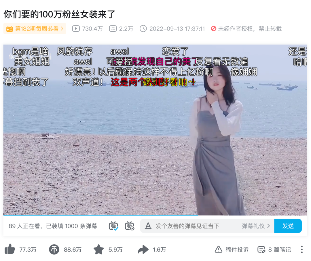 為什么說(shuō)平平無(wú)奇呢?這位 up主沒(méi)有超高的顏值,沒(méi)有山城小栗旬個(gè)性化的傳奇人設(shè),也沒(méi)有做飯、養(yǎng)寵等漲粉 buff……但是,作為素人的她在 B站發(fā)的第一條 5 分鐘小視頻,其播放量就突破百萬(wàn),此后她的視頻更是一路爆火,讓她在不到半年的時(shí)間里,迅速積累超過(guò) 100 萬(wàn)粉絲。這個(gè) up主到底是誰(shuí)?為什么能夠憑借素人身份爆火出圈?