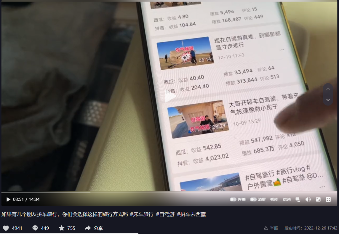 例如遇到一位《大哥開轎車自駕游,帶著充氣帳篷像做小房子》,拍攝視頻帶大家觀摩這個(gè)大哥的帳篷,視頻時(shí)長(zhǎng)8分鐘,點(diǎn)贊達(dá)到5.1萬。