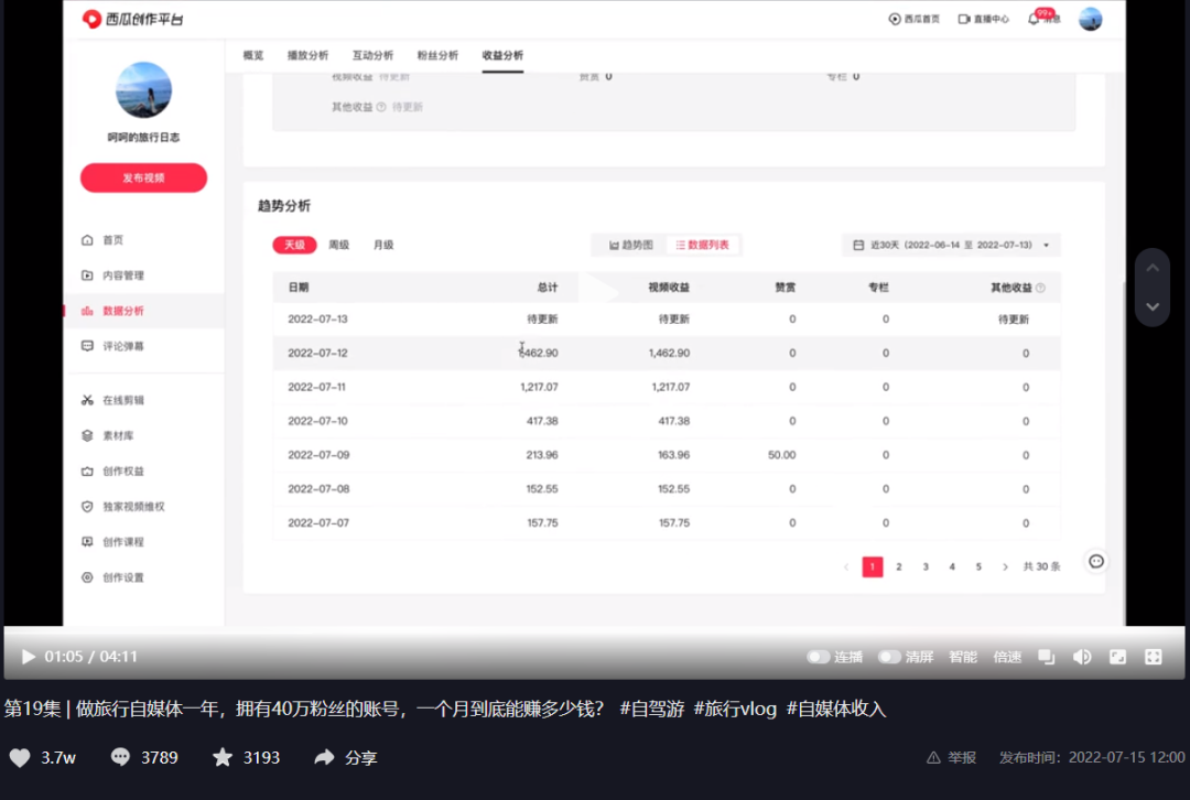 例如另外一位旅游博主@呵呵的旅行日記,粉絲數(shù)達(dá)到40多萬,在2022年7月份也拍了條視頻曝光自己的收入,一年多時(shí)間賺了7.8萬元。