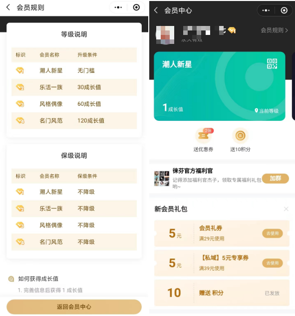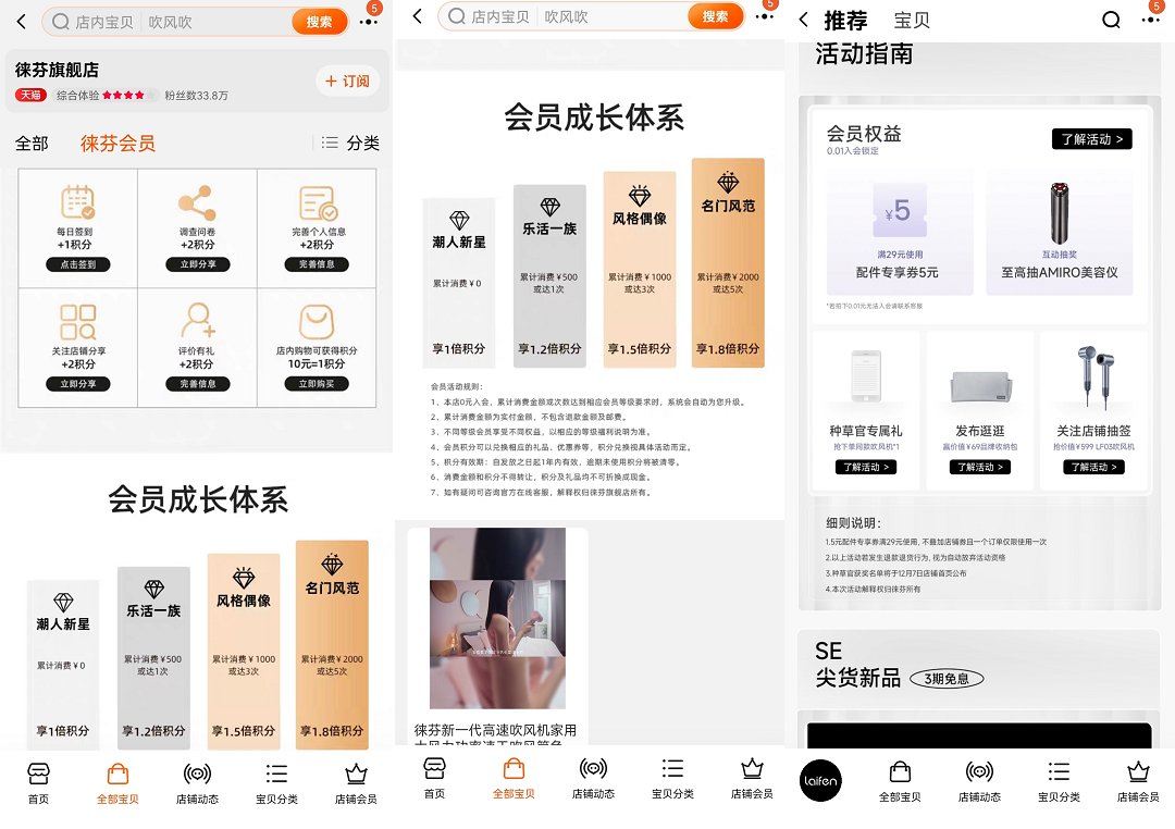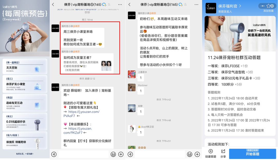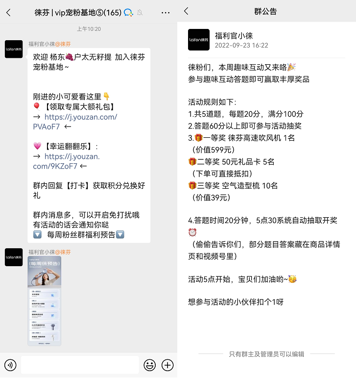 朋友圈內(nèi)容:主要為產(chǎn)品種草、活動推廣、社群引流等內(nèi)容社群作為私域的主要承載形式之一,是企業(yè)做私域重點運營的方向。而徠芬的社群從規(guī)劃到內(nèi)容再到服務都做得不錯,定位明確,內(nèi)容清晰,服務及時,能讓用戶一進來就知道群是干什么的,自己能獲得什么,又能做什么。下面以我加入的社群為例:社群價值:專屬禮包、福利活動、打卡獲積分、護發(fā)小課堂、有獎互動等;社群歡迎語及群公告:歡迎語主要是引導用戶領(lǐng)取禮包、 參與小抽獎、打卡和查閱每周福利預告,了解社群活動安排;而群公告是用來發(fā)布福利活動內(nèi)容。用戶一進社群,就能收到一張「預告圖」,詳細說明了社群每一周內(nèi)的社群活動:另外還會自動發(fā)送相關(guān)的社群福利,以及告知用戶「打卡」的玩法。徠芬社群內(nèi)的許多活動都值得借鑒。例如每周的互動答題,只要答對100分,就能參與周五的0.01元秒殺活動。活動最高獎品是徠芬高速吹風機,二等獎是造型梳,三等獎是50元電子卡,四等獎是100積分。從玩法來看,用抽獎吸引用戶參與周四的互動答題,達成活躍度,再鎖定獲得100分的用戶,周五來群內(nèi)里參與活動,讓用戶時刻記得社群,增強品牌心智。徠芬在微信小程序和電商平臺中設置會員體系,兩者都是以成長會員+積分體系為主,福利的內(nèi)容略微會有不同。小程序會員分為4個等級:潮人新星(無門檻)、樂活一族(30成長值)、風格偶像(60成長值)、名門風范(120成長值),會員主要權(quán)益包括送優(yōu)惠券和送積分。用戶主要通過購物(每消費100元獲得3點成長值)來獲取成長值,如需升級到最高級則需要消費4000元。
