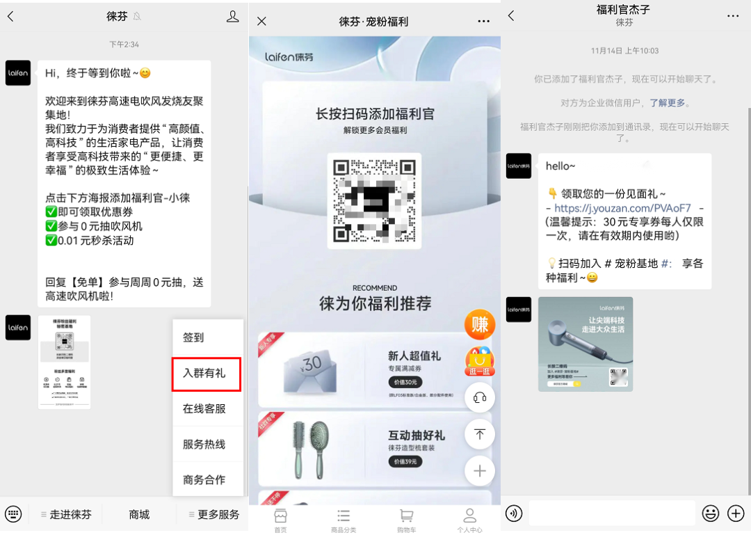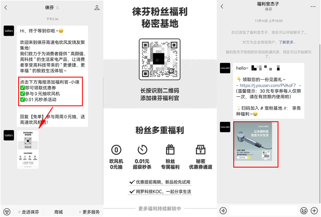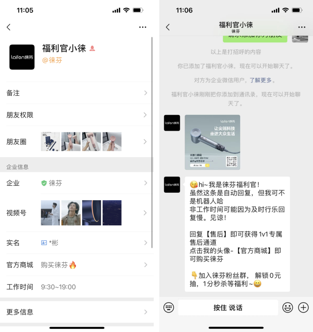 路徑一:在關(guān)注徠芬官方公眾號后,即可收到「徠芬福利官」企業(yè)微信二維碼,通過福利引導用戶添加,再進一步引導添加社群。