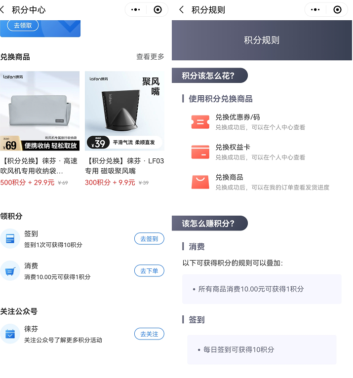積分體系:徠芬的積分可從簽到和消費獲得,且消費獲得積分的比例和普遍的品牌不一樣,消費10元才獲得1積分,而簽到1天就可得10積分;而積分可兌換的商品就2個,還都是抵現(xiàn)的形式。考慮是簽到更容易獲得積分,是因為用高積分,養(yǎng)成用戶簽到習慣,增加小程序活躍度,強化品牌心智,而積分兌換又能提升銷售。