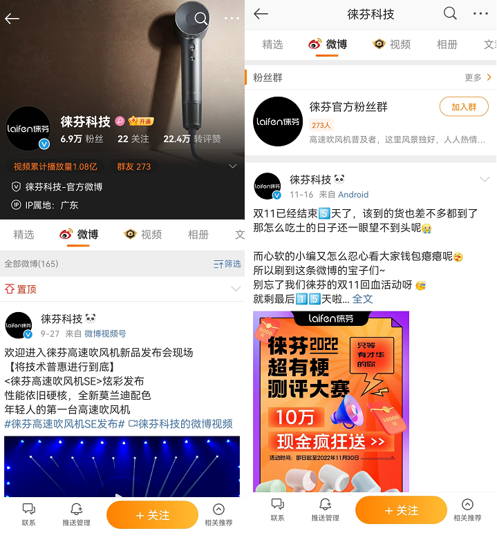 徠芬在抖音主要有3個賬號,總粉絲超過150萬,每個賬號每日都會開啟直播,視頻內(nèi)容主要以產(chǎn)品種草、直播片段、情景式種草為主。另外在抖音搜索徠芬,直接展示的是徠芬在抖音上的成績排名和產(chǎn)品廣告,擴大品牌影響力的同時,也能讓新用戶看到品牌實力,從而促進首單轉(zhuǎn)化。徠芬在微博粉絲達到6.9萬,發(fā)布頻率一個月10條左右,內(nèi)容主要以品宣、活動推廣、節(jié)日祝福、有獎互動等為主。另外用戶可以申請進入徠芬官方粉絲群。