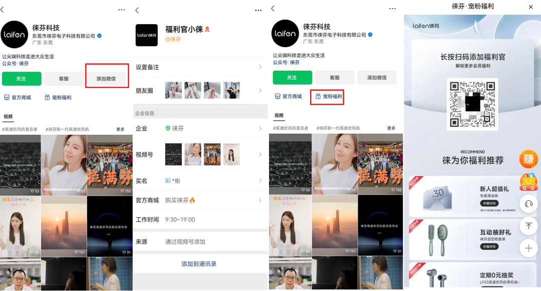 徠芬在視頻號主頁設置了「添加微信」入口,用戶點擊可添加福利官小徠;另外在首頁點擊「寵粉福利」會跳轉(zhuǎn)到小程序添加福利官杰子,再引導用戶入福利群。