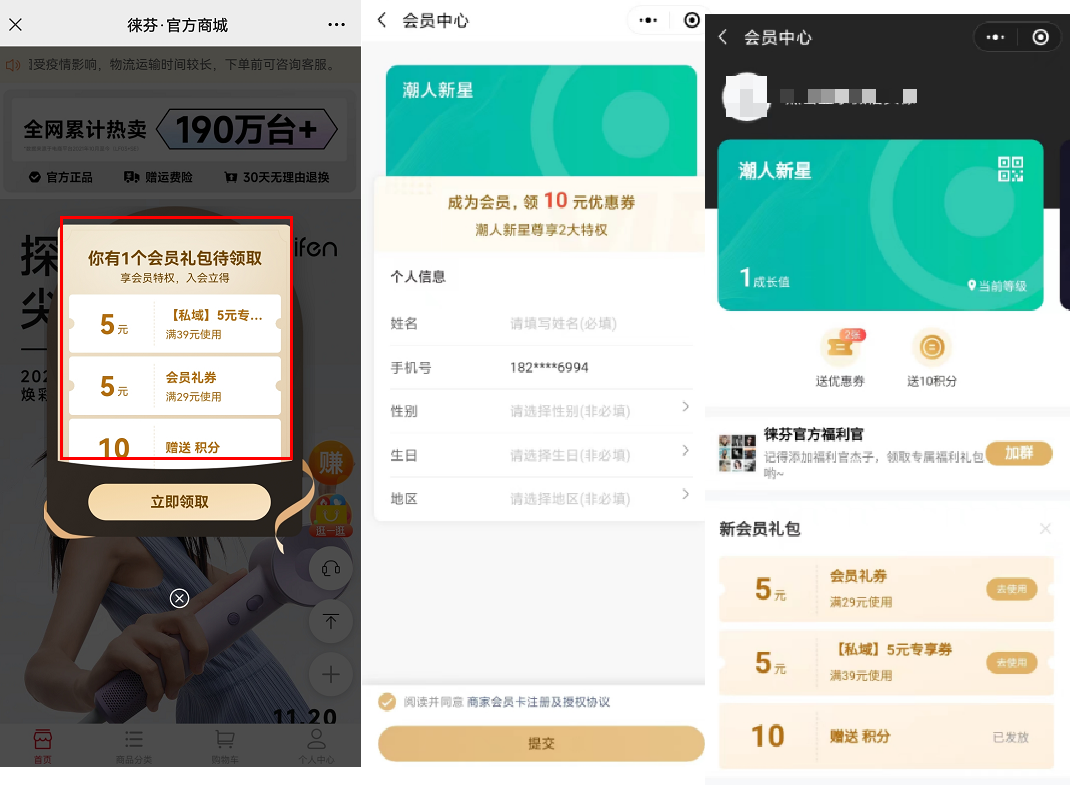 值得一說的是,新用戶在進入小程序的第一時間,會彈出優(yōu)惠禮包,點擊領(lǐng)取會跳轉(zhuǎn)會員中心填寫個人信息,填寫后會跳轉(zhuǎn)會員中心頁面,再引導用戶加群。這一連串動作值得借鑒,不僅得到用戶畫像,促進首單轉(zhuǎn)化,還能引流社群留存。