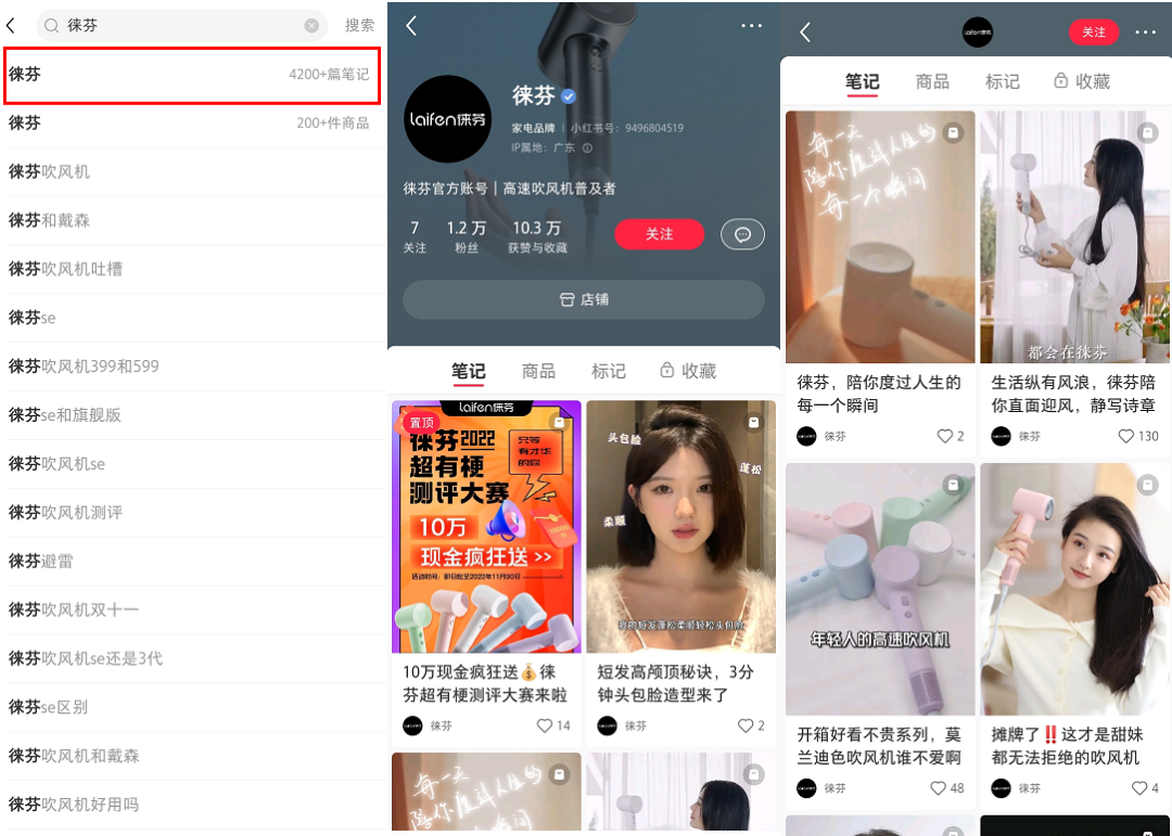徠芬在小紅書中的相關(guān)筆記4500+篇,官方賬號粉絲達到1.2萬,筆記內(nèi)容以產(chǎn)品種草、活動為主。在賬號主頁設置了店鋪鏈接,進一步引導種草轉(zhuǎn)化。