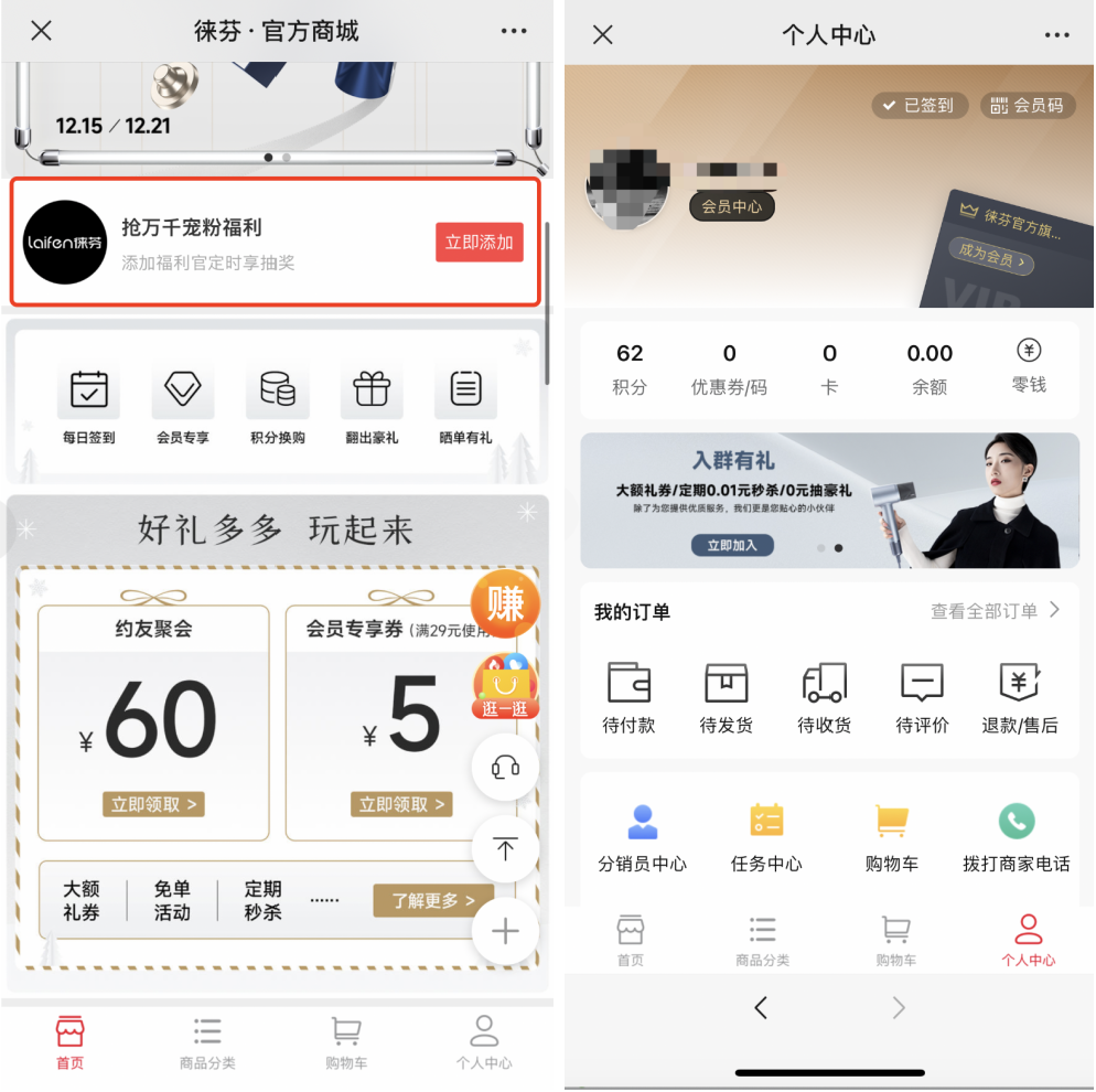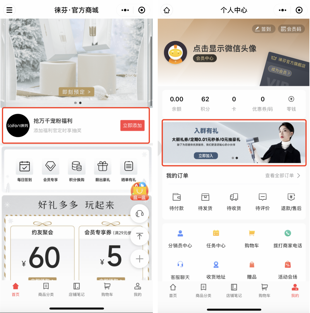 在徠芬的小程序「徠芬官方商城」,「首頁」和「我的」頁面中都設置了私域觸點,添加福利官即可進入社群。