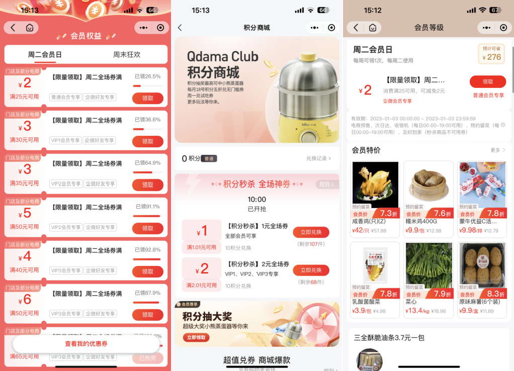 會員等級越高享受的權益越,包括會員特價、積分抵現、生日禮券、預約留菜、運費優(yōu)惠等。