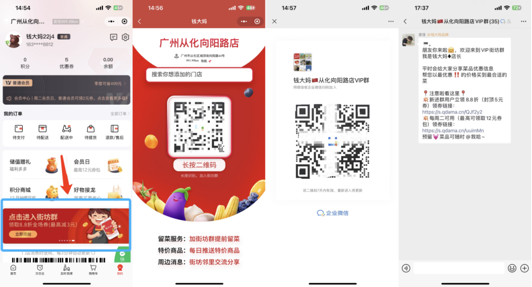 引流路徑2:在商城個人中心,底部有循環(huán)banner圖,點擊「點擊進入街坊群」,根據定位會跳轉到附近線下店鋪,點擊識別即可跳出社群二維碼,長按二維碼會自動加入社群。