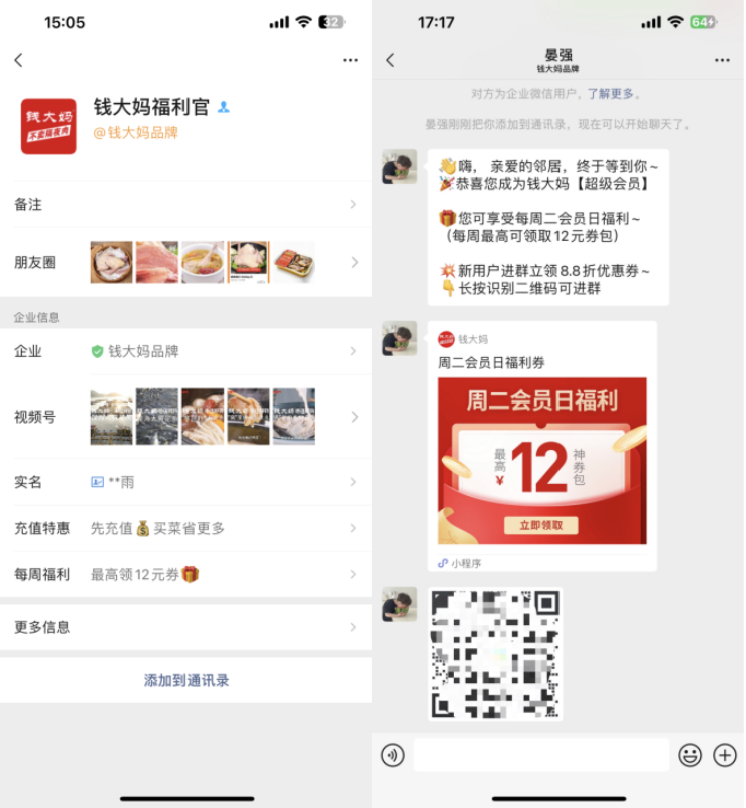 自動歡迎語:添加企微后,企微自動發(fā)送歡迎語。歡迎語中附帶社群二維碼,長按識別二維碼即可加入社群,并且會自動發(fā)送「周二會員日福利券」的小程序鏈接,引導用戶成為付費會員。