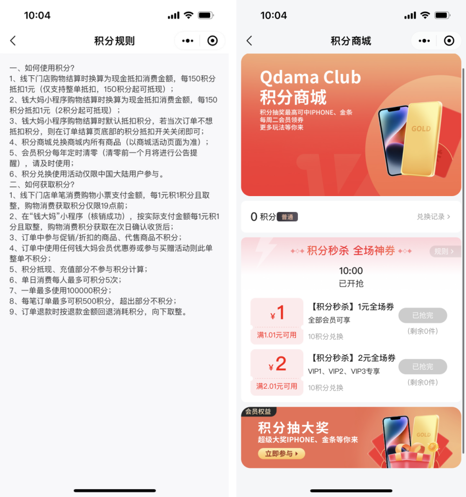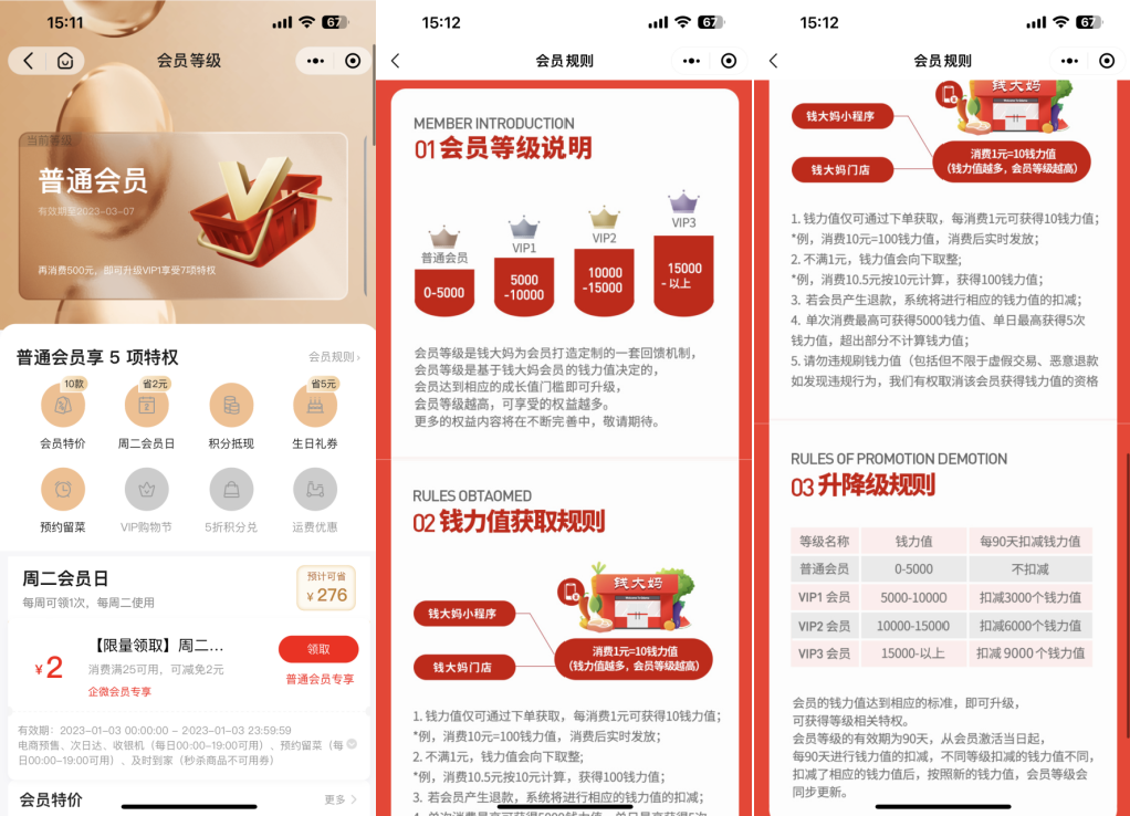 錢大媽會員將「錢力值」與成長體系相結合,通過增加錢力值來激勵用戶,提升活躍度以及產生購買。錢力值僅可通過下單獲取,每消費1元可獲得10錢力值,用于等級成長、優(yōu)惠換購及產品兌換等。