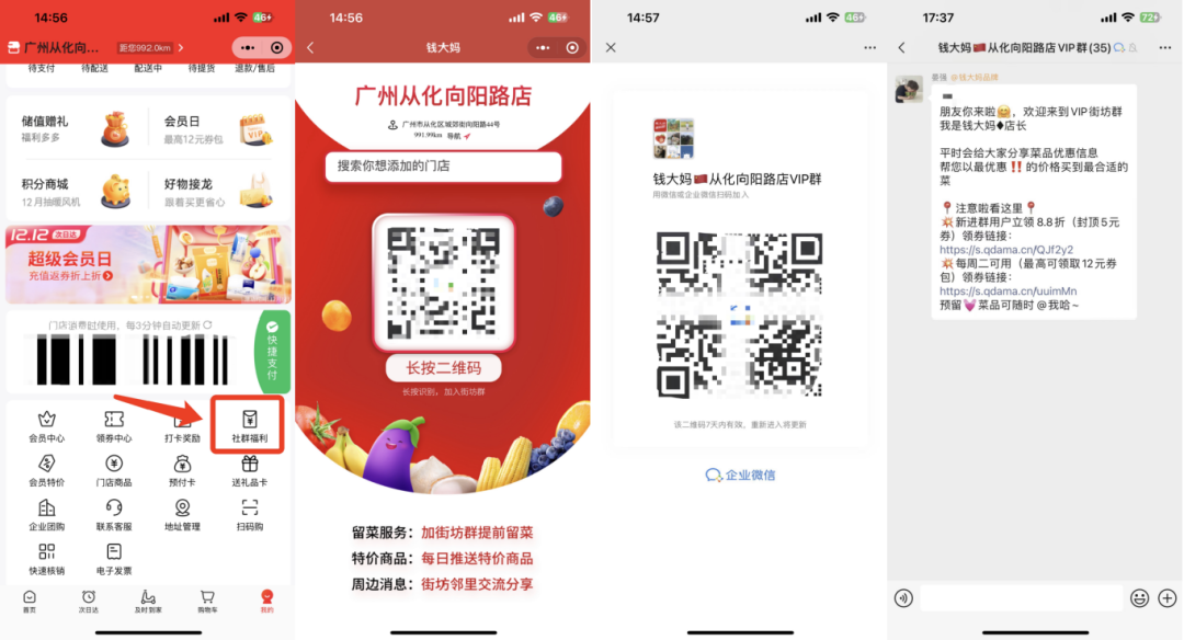 引流路徑3:在商城個人中心底部有「社群福利」,點擊后系統會根據定位跳轉到附近線下店鋪,點擊識別即可跳出社群二維碼,長按二維碼會自動加入社群。