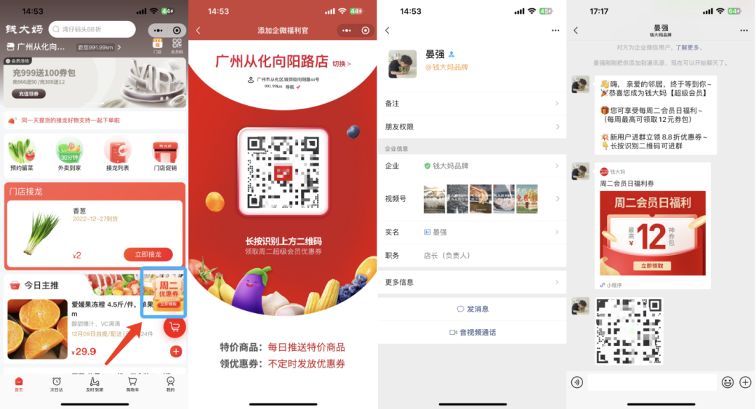 引流路徑1:在首頁,利用「周二優(yōu)惠券」的福利吸引用戶點擊,點擊后根據定位跳轉到附近線下店鋪,長按即可掃碼添加對應門店店長企微。添加成功,企微自動發(fā)送社群二維碼。