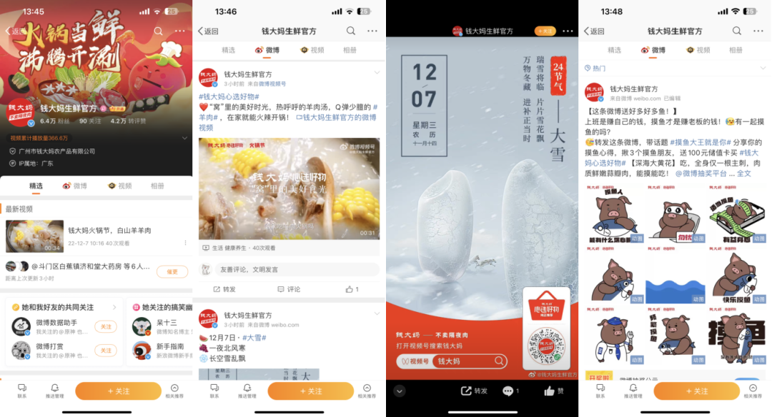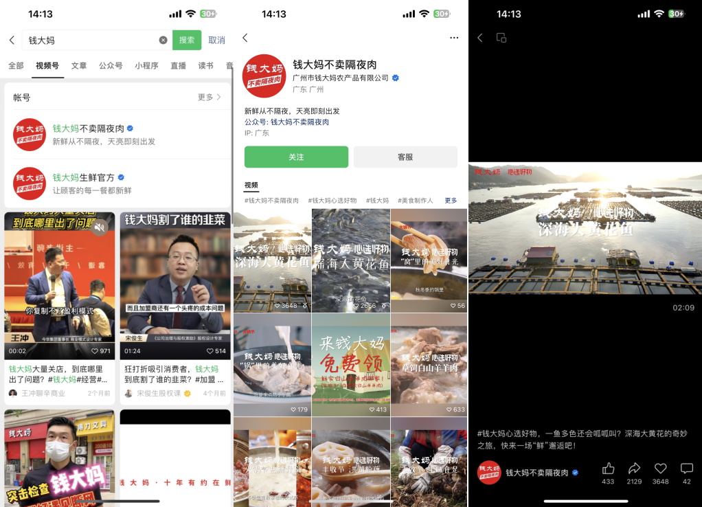 錢大媽在視頻號有2個賬號,「錢大媽不賣隔夜肉」和「錢大媽生鮮官方」,視頻號賬號主要內容是產品介紹、福利活動、會員推廣以及美食分享等。