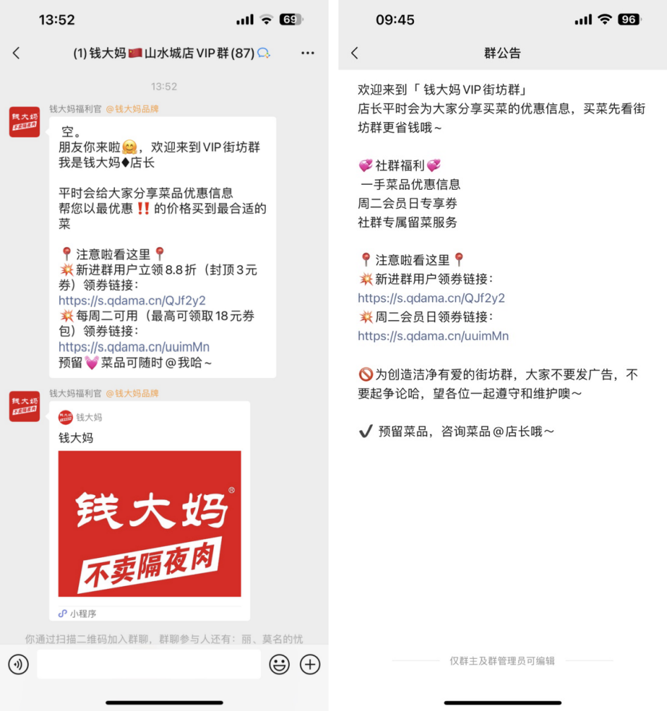 用戶入群后會第一時間觸發(fā)自動歡迎語,主要引導領取新進群88折優(yōu)惠券和每周二福利券,群引導預留菜品可以隨時@店長(群主)。群公告和歡迎語是一樣的內容。