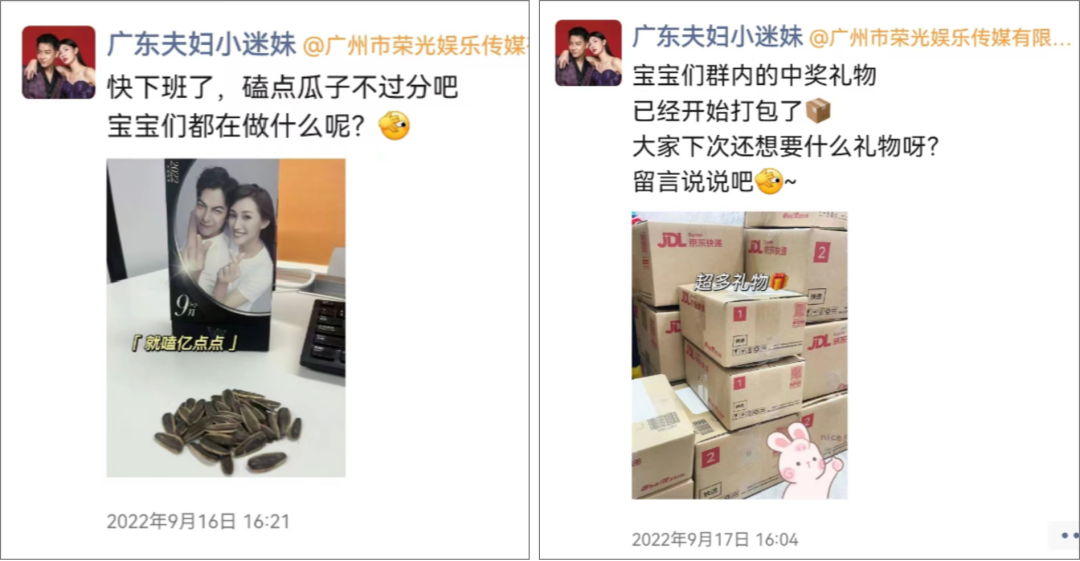 比如曬自己一邊嗑瓜子一邊坐等下班;再比如曬自己打包粉絲中獎(jiǎng)禮物的瞬間,這樣一來(lái)既拉進(jìn)用戶的心理距離,又讓用戶看到「中獎(jiǎng)的真實(shí)性」。