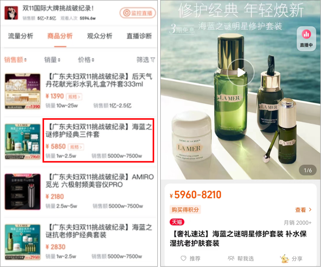 總價(jià) 1390 元的天氣丹禮盒,總銷量在 10-25w 之間,其單品銷售額就超過(guò) 1 億;總價(jià) 5850 元的海藍(lán)之謎經(jīng)典三件套,更是賣出了 1w 多套,銷售額超過(guò) 5000w,與之對(duì)比,天貓官方旗艦店的同價(jià)位產(chǎn)品,月銷量才 2000+……