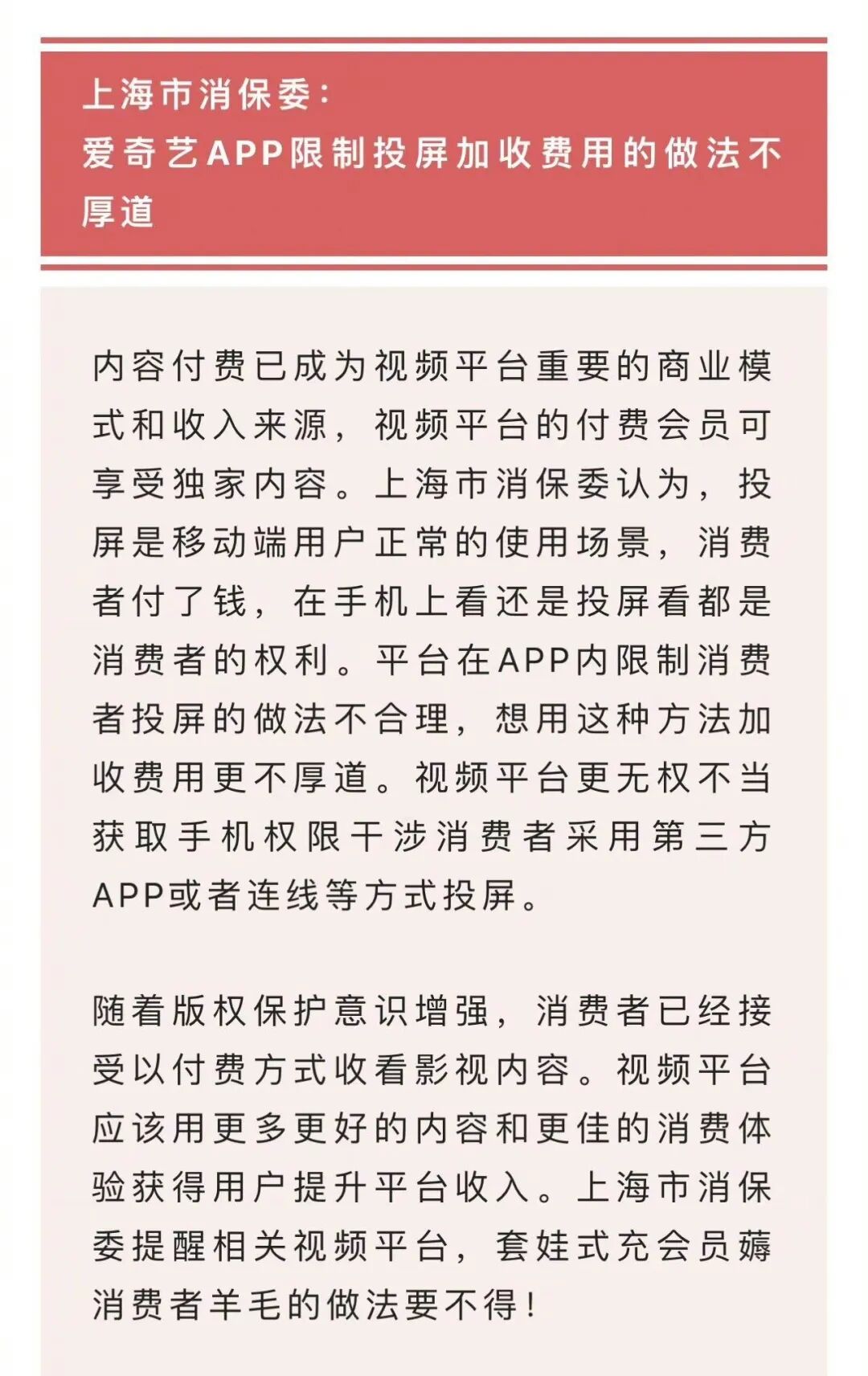 對此,上海市消保委站出來主持公道,認為“投屏是移動端用戶正常的使用場景,消費者付了錢,在手機上看還是投屏看都是消費者的權(quán)利。平臺在APP內(nèi)限制消費者投屏的做法不合理,想用這種方法加收費用更不厚道。”