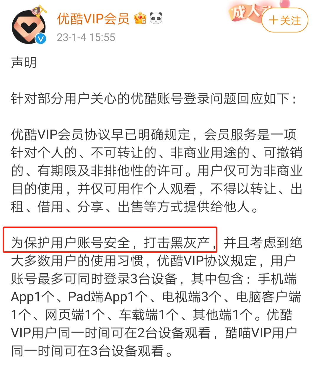 酷喵VIP相比優(yōu)酷VIP而言,除了投屏,還可以多登錄一個設(shè)備。這源于優(yōu)酷另一個惹眾怒的舉措。根據(jù)優(yōu)酷官方聲明,從2022年12月20日起,優(yōu)酷VIP用戶同一時間可在2臺設(shè)備觀看,酷喵VIP用戶同一時間可在3臺設(shè)備觀看。優(yōu)酷美其名曰“為保護用戶賬號安全,打擊黑灰產(chǎn)”,但很明顯這是為了限制用戶之間共享賬號,提高會員付費率。優(yōu)酷此舉也被網(wǎng)友吐槽為格局小了,吃相難看,自作聰明。