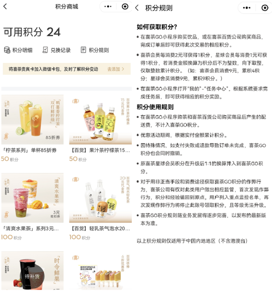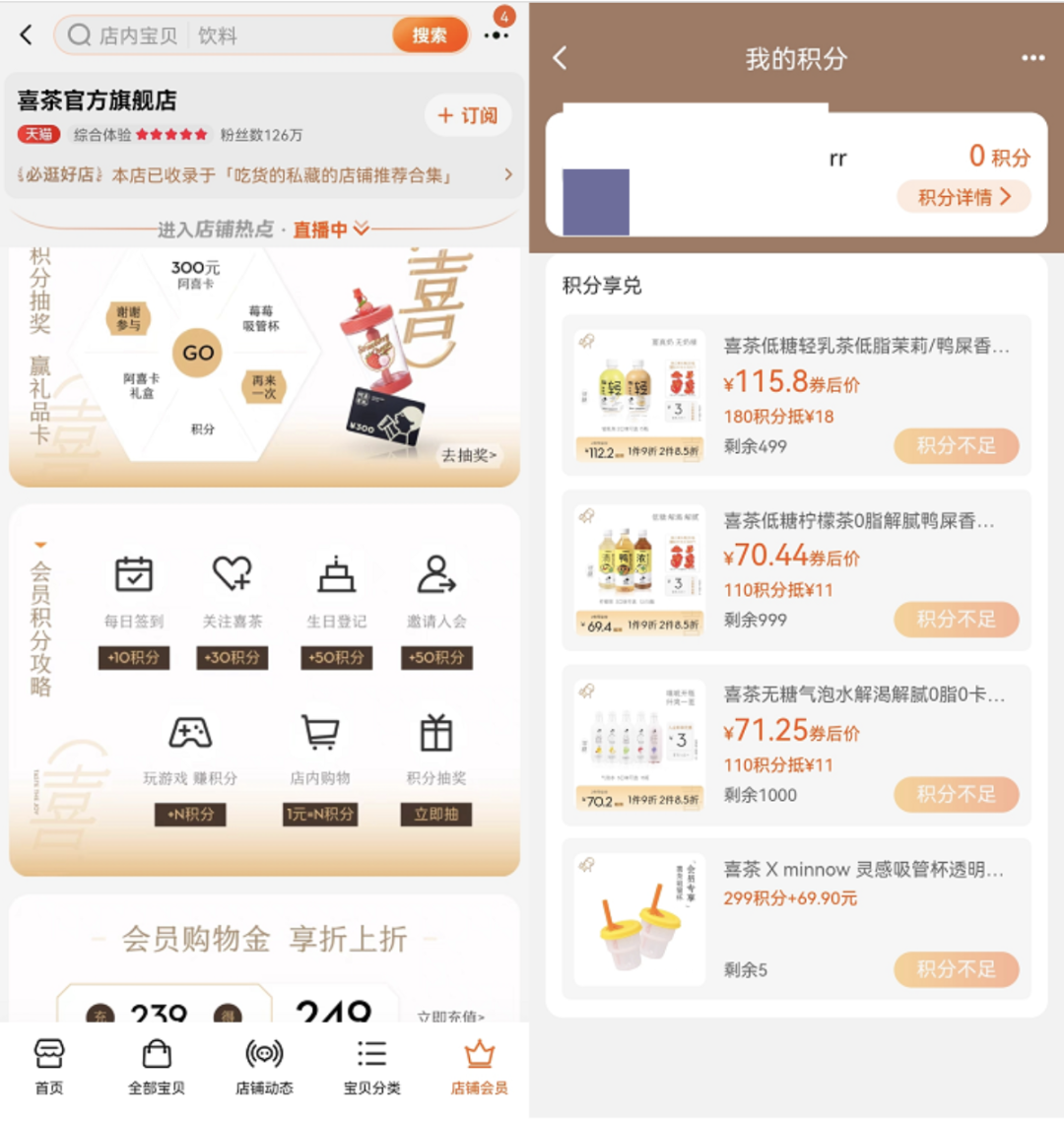 目前喜茶在小程序/app和電商平臺中有會員的入口。