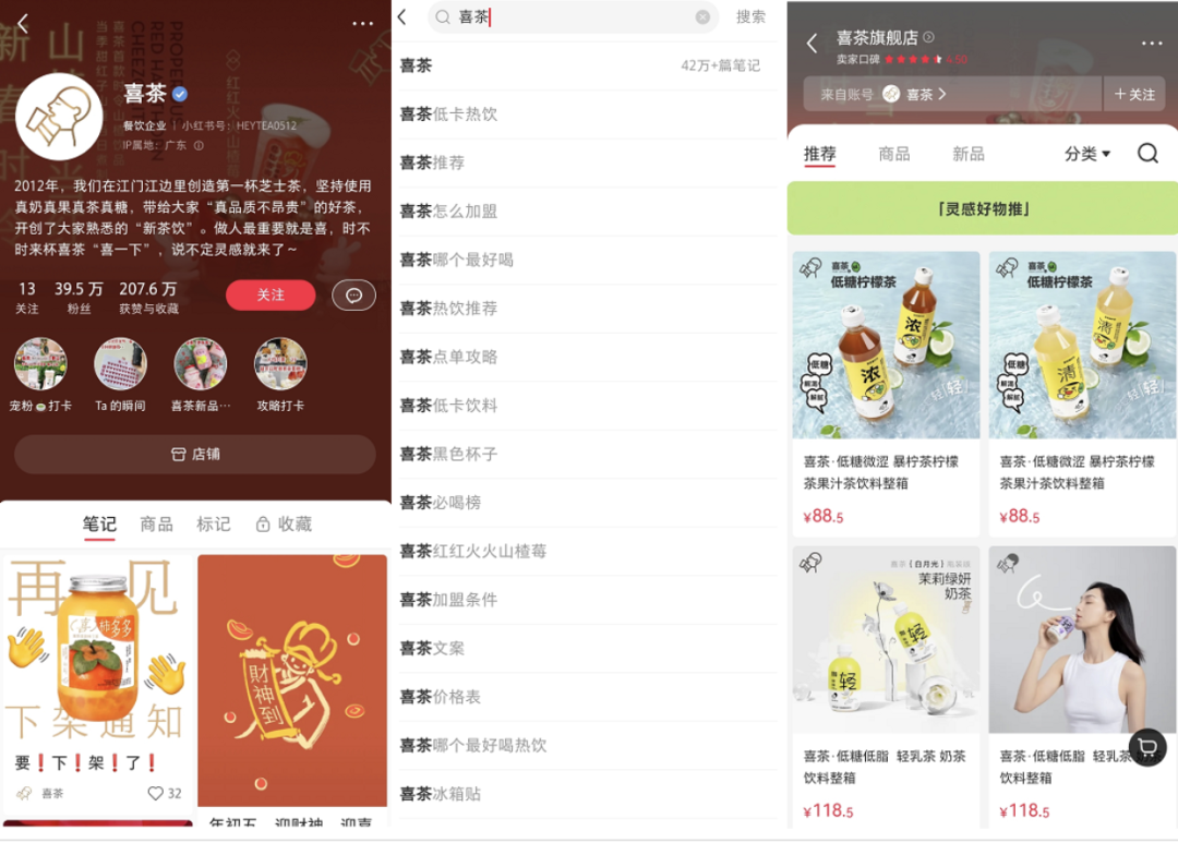 小紅書:喜茶在小紅書有超過42萬的筆記,39.5萬粉絲,內(nèi)容以有獎互動、話題互動、聯(lián)名活動、產(chǎn)品種草為主。