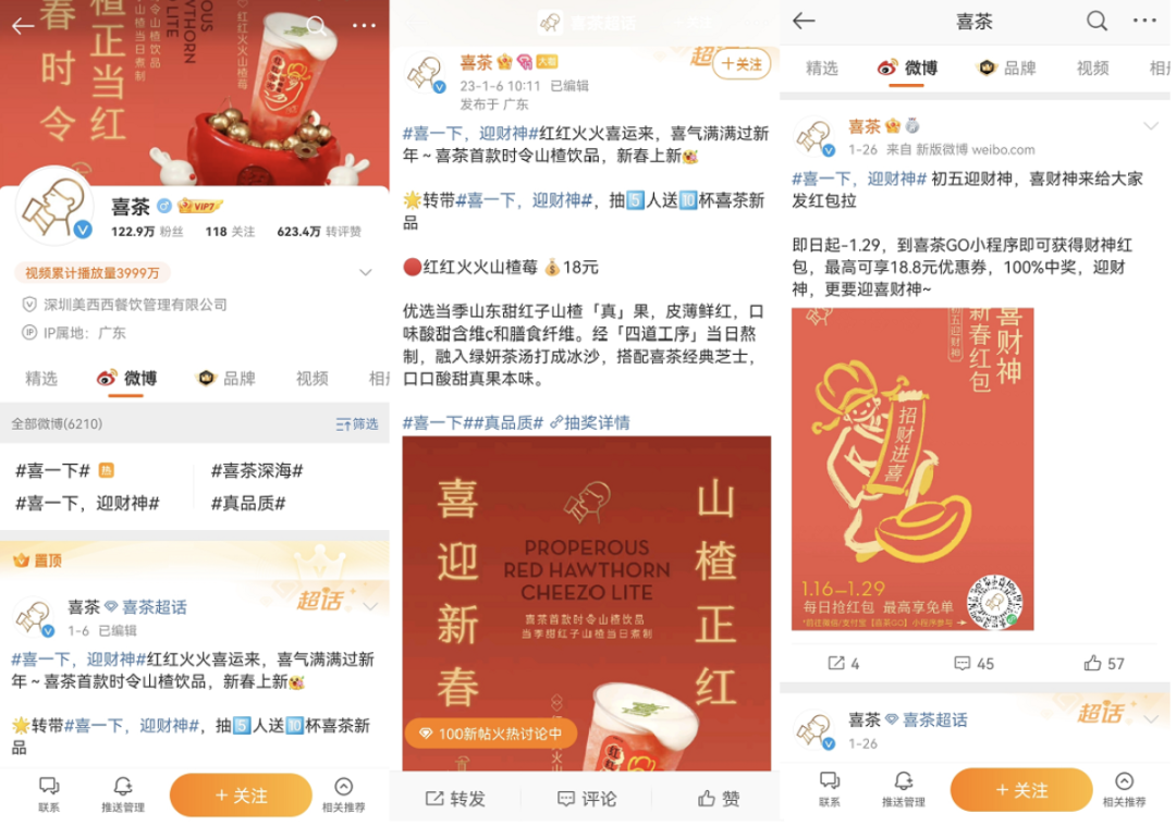 微博:喜茶在微博共有123萬粉絲,每天都會發(fā)布1-2條內(nèi)容,內(nèi)容多數(shù)是有獎互動,節(jié)日熱點(diǎn)、話題互動、產(chǎn)品活動等。并且會以文字+海報(bào)的形式引導(dǎo)用戶進(jìn)入小程序。
