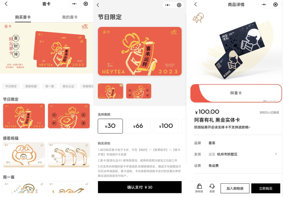 儲值卡:喜茶的儲值卡有多種主題,最低面額不低于30,不高于888,可自用可送好友。為了滿足不同用戶需求,喜茶也有實(shí)體卡,但僅有100元一種面額。