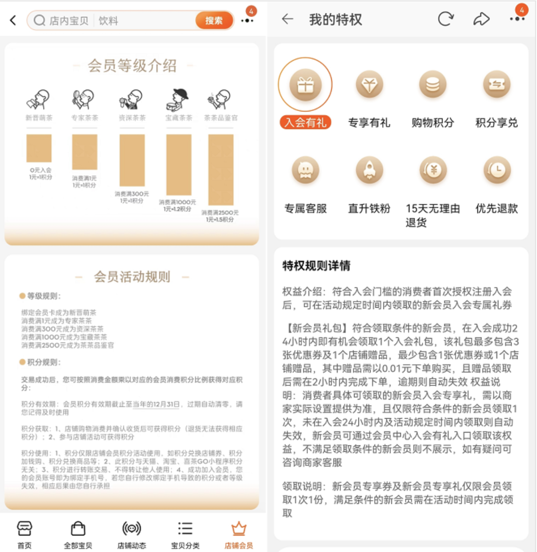 會員權(quán)益包括:入會有禮、專享有禮、購物積分、積分享兌、專屬客服、直升鐵粉、15天無理由退貨、優(yōu)先退款。