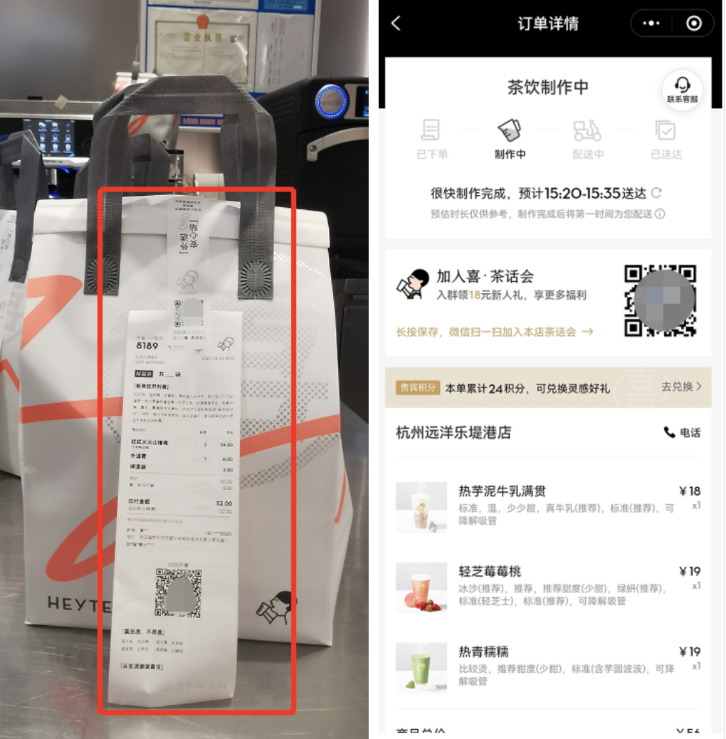 在喜茶線下門店隨處可見二維碼立牌,另外在用戶點(diǎn)單的程序碼以及訂單小票中都設(shè)置了私域觸點(diǎn)的引流。