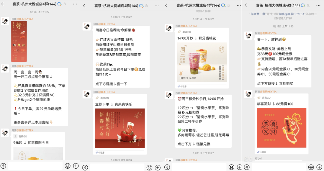 2)社群運(yùn)營缺乏互動:喜茶的社群可圈可點(diǎn),好的是在公眾號、小程序和視頻號的社群觸點(diǎn)路徑很順,而社群內(nèi)容中規(guī)中矩,和多數(shù)快消品牌一樣,產(chǎn)品活動很多,但缺失與用戶之間的互動。