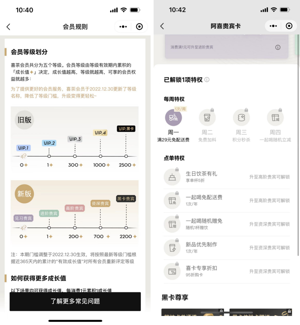 喜茶的成長型會員有5個等級,分為:見習(xí)貴賓(免費(fèi)注冊)、進(jìn)階貴賓(1+成長值)、高階貴賓(200+成長值)、資深貴賓(700+成長值)、黑卡貴賓(2200+成長值),通過成長值進(jìn)行升級(消費(fèi)1元=1成長值)。