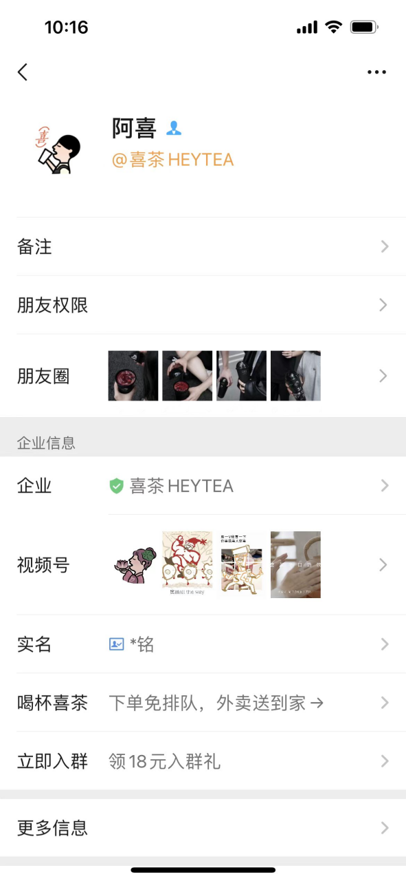 企微名片:在每個阿喜的企微名片里,都能看到綁定視頻號、小程序以及入群的鏈接,合理地利用了資源,多維度進(jìn)行引流。