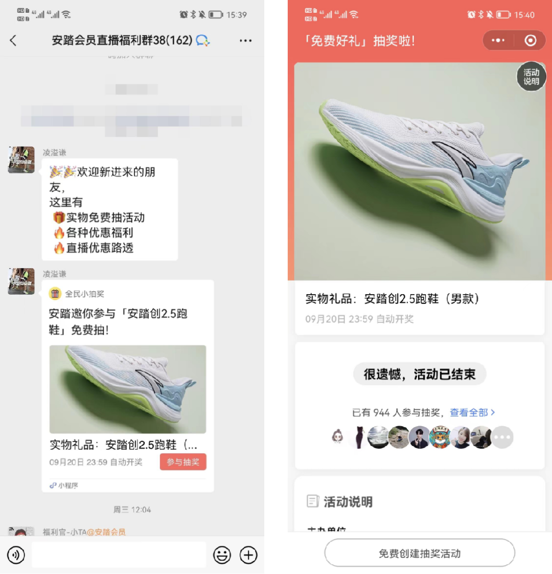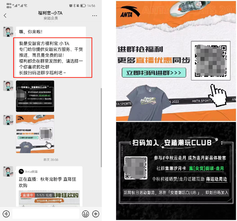 1、精細化運營:安踏的社群分為福利群、直播群、興趣群等類型社群。不同的社群運用不同的運營策略,在社群內發(fā)布內容,實現(xiàn)用戶活躍度提升和促進轉化復購。