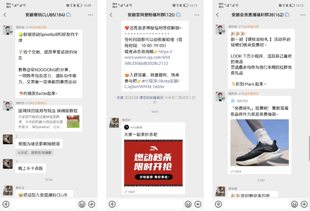 安踏對社群進行了精細化分層運營,主要針對用戶的需求分為興趣群、福利群和直播群三種類型: