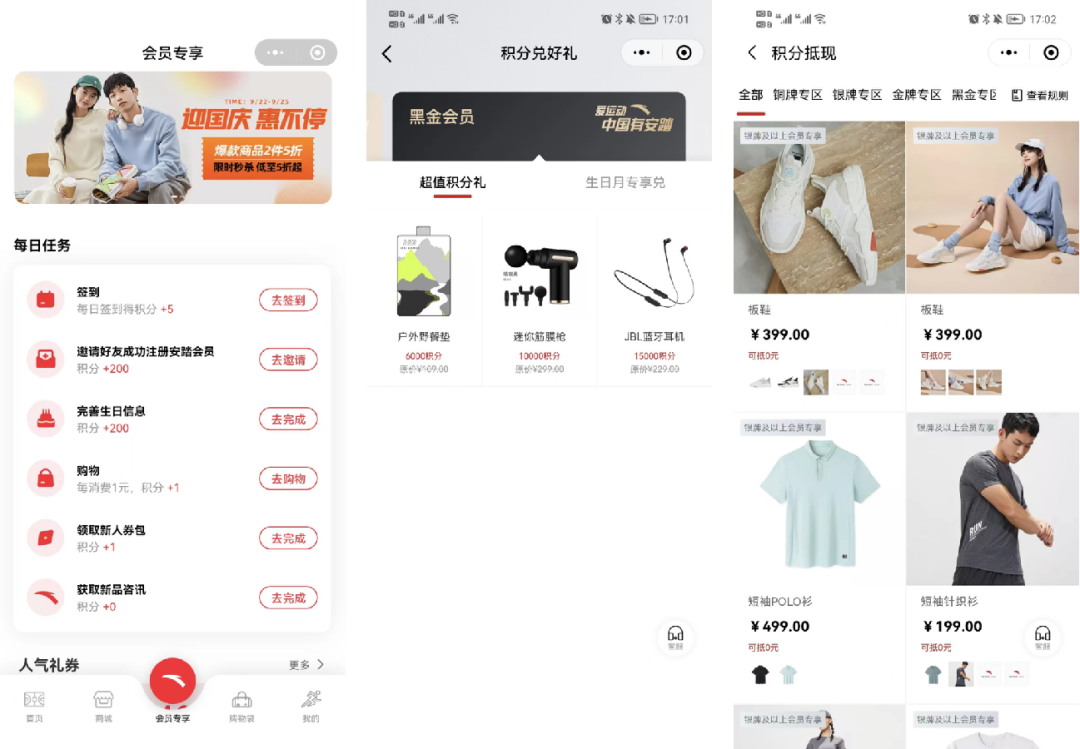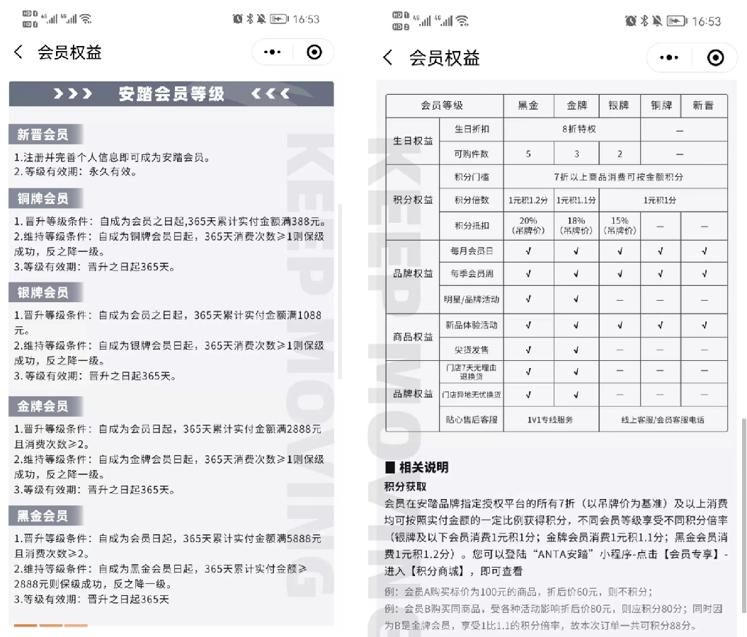 根據(jù)會員的不同等級,安踏會員享受相應權益及優(yōu)惠,包括會員生日折扣、會員積分兌換、會員積分抵現(xiàn)、會員專屬優(yōu)惠、會員專享活動、會員品牌活動、會員專屬服務等。