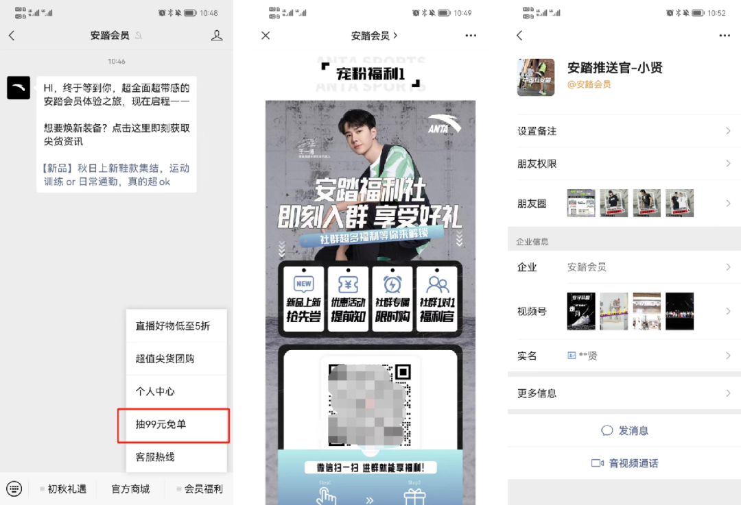 目前設置了3個企微號:安踏推送官-小賢/福利官-小TA/譚戀,運營動作基本一致,下面以福利官-小TA為例進行拆解:
