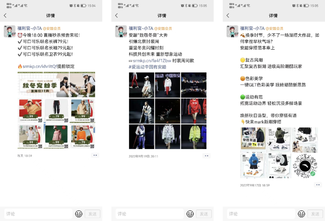2、IP運營不足:安踏設置的企微IP較多,針對不同渠道的用戶,用不同企微承接,再邀請到不同的社群,反而會顯得復雜臃腫。而且每個企微IP運營基本一致,朋友圈內容都是產(chǎn)品相關的廣告內容,缺少一些“人性化”的內容。