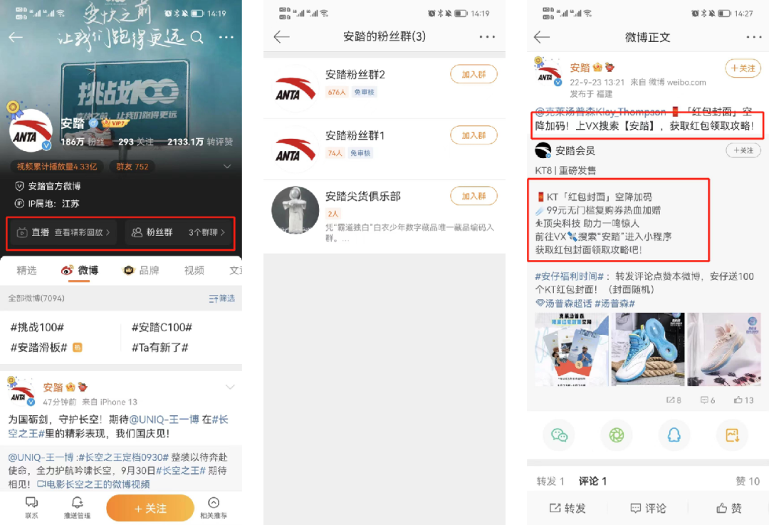 安踏在微博的主賬號有186萬粉絲,微博主要是發(fā)布品牌宣傳、活動宣傳、產(chǎn)品推廣等內容。首頁有設置粉絲群引流入口,點擊即可免審核加入社群。另外,微博會通過活動將用戶引流到微信。