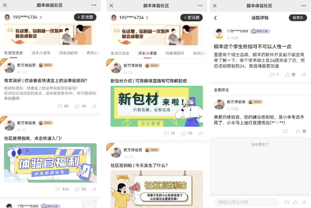 通過公眾號菜單欄,用戶可參與到「體驗社區(qū)」。社區(qū)有用戶反饋、用戶調(diào)研、解疑答惑、順豐課堂等功能。