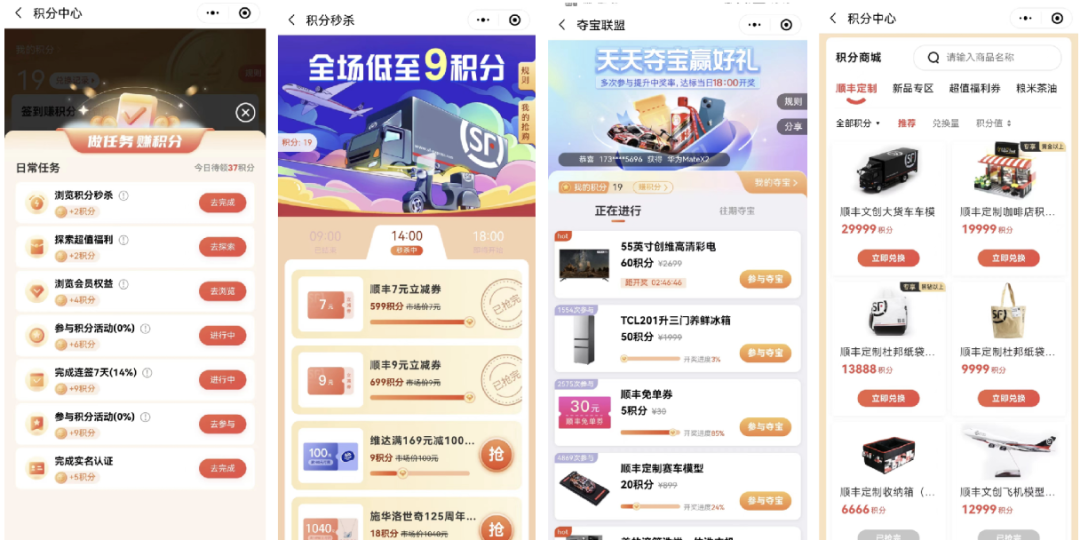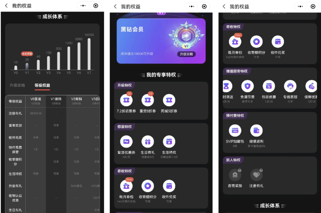 2)會員體系完整:順豐的會員體系包含成長會員+付費會員+積分體系,權(quán)益都較為豐富,立得的優(yōu)惠屬性也增強了用戶粘性,進一步促使用戶產(chǎn)生更多轉(zhuǎn)化。