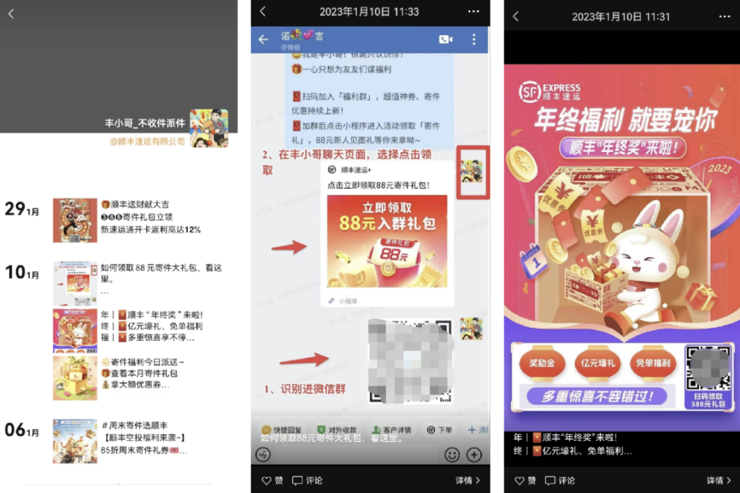 小程序:順豐在小程序中「88元寄件禮包」為誘餌,吸引用戶點擊添加企微「豐小哥」,由企微邀請加入社群。
