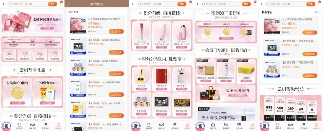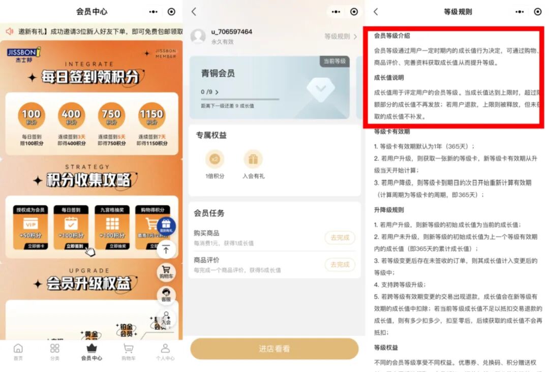杰士邦在微信小程序和電商平臺(tái)中設(shè)置會(huì)員體系+成長(zhǎng)體系,福利的內(nèi)容略微會(huì)有不同。
