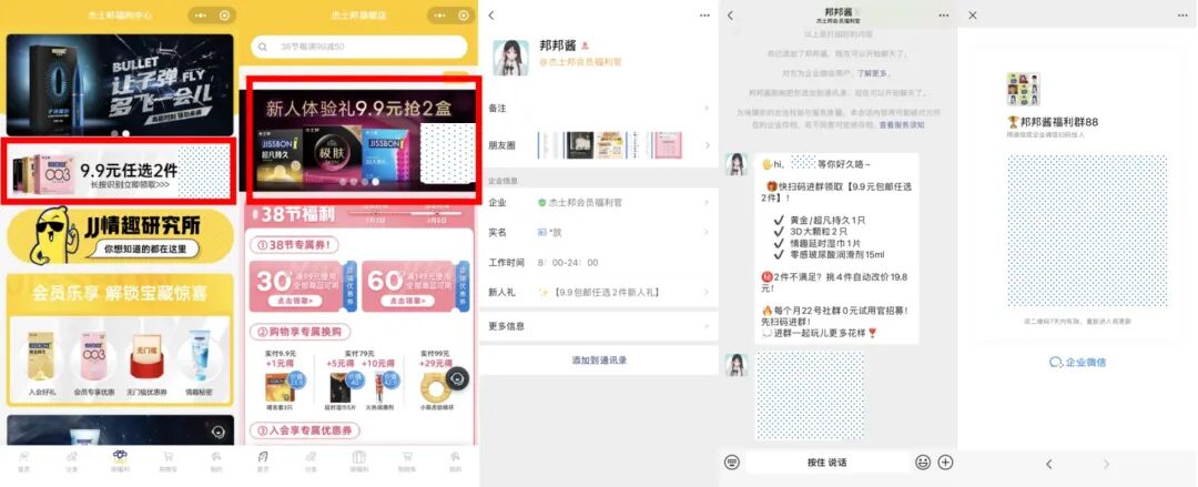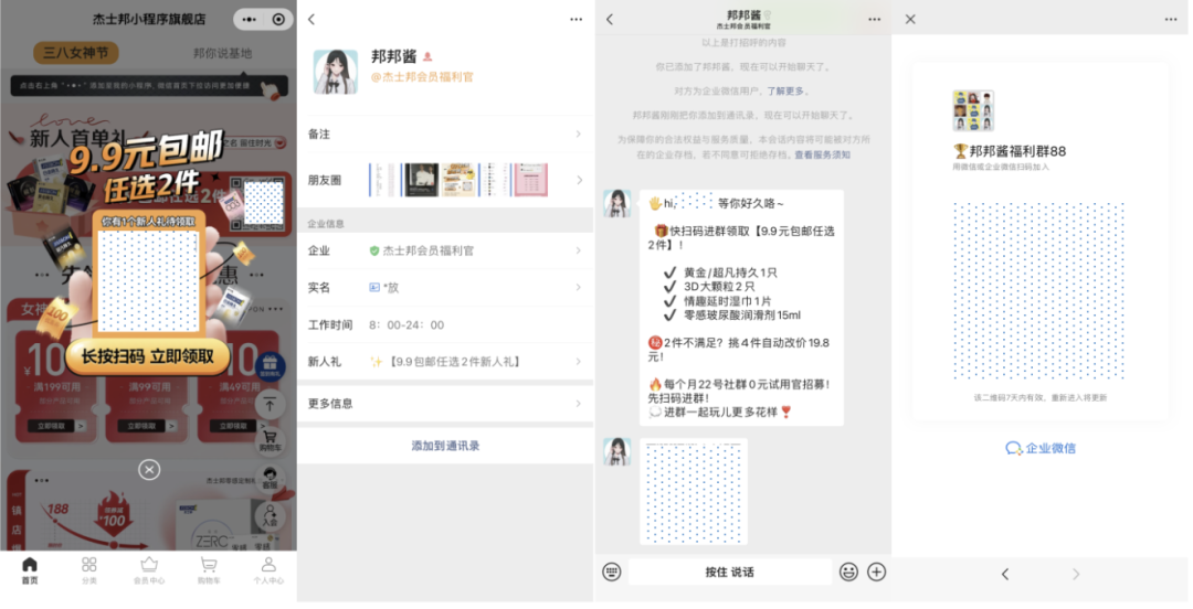 引流路徑2:在商城首頁(yè)/領(lǐng)福利頁(yè)面,用【9.9元任選2件】新人福利吸引用戶(hù),長(zhǎng)按即可掃碼添加企微【福利官-邦邦醬】。添加成功,企微會(huì)自動(dòng)發(fā)送進(jìn)群二維碼。