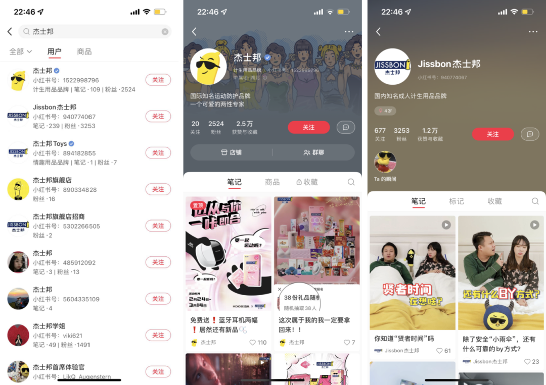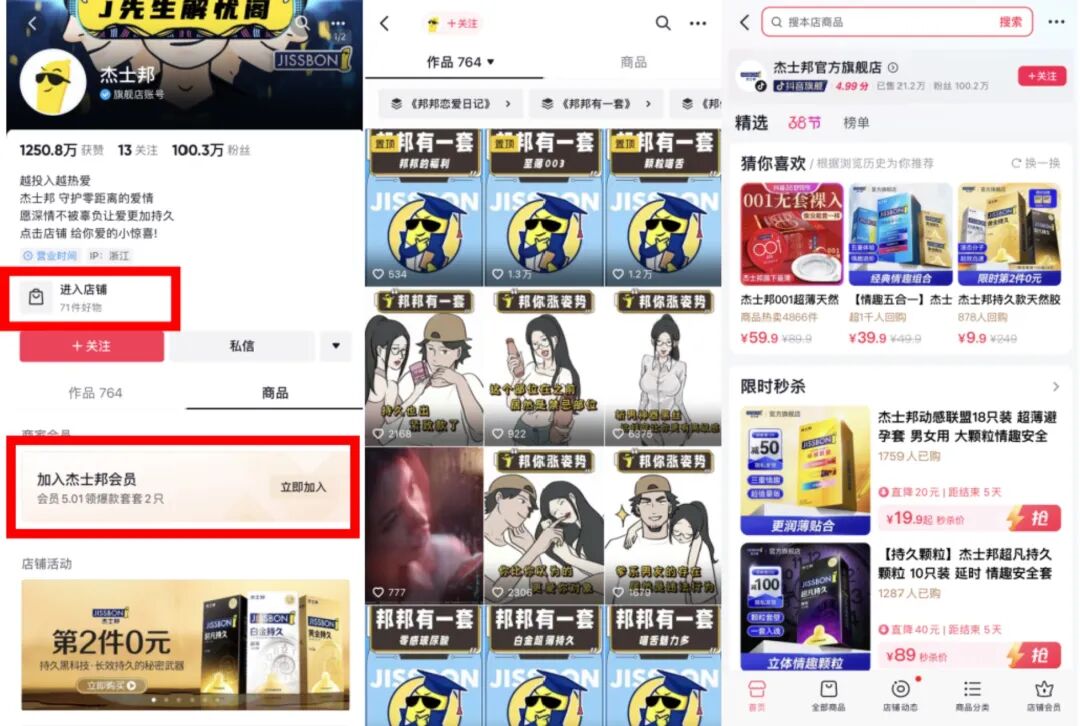 抖音:杰士邦在抖音的主賬號(hào)名字為【杰士邦】,有100.3w粉絲,賬號(hào)主要是推廣產(chǎn)品、福利介紹、知識(shí)分享等內(nèi)容。